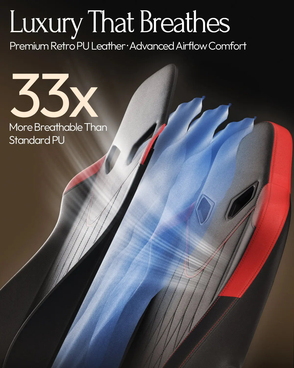 Even with the heating function active, this adult gaming chair always feels fresh. The high-quality gaming office chair leather is 33 times more breathable than standard PU material, ensuring continuous airflow. This is complemented by a unique 12 cm thick spring-core seat cushion whose integrated springs provide exceptional softness, perfect body support, and long-lasting elasticity. It combines cooling ventilation, cozy warmth, and cloud-like cushioning – ideal for long gaming sessions or demanding workdays. -