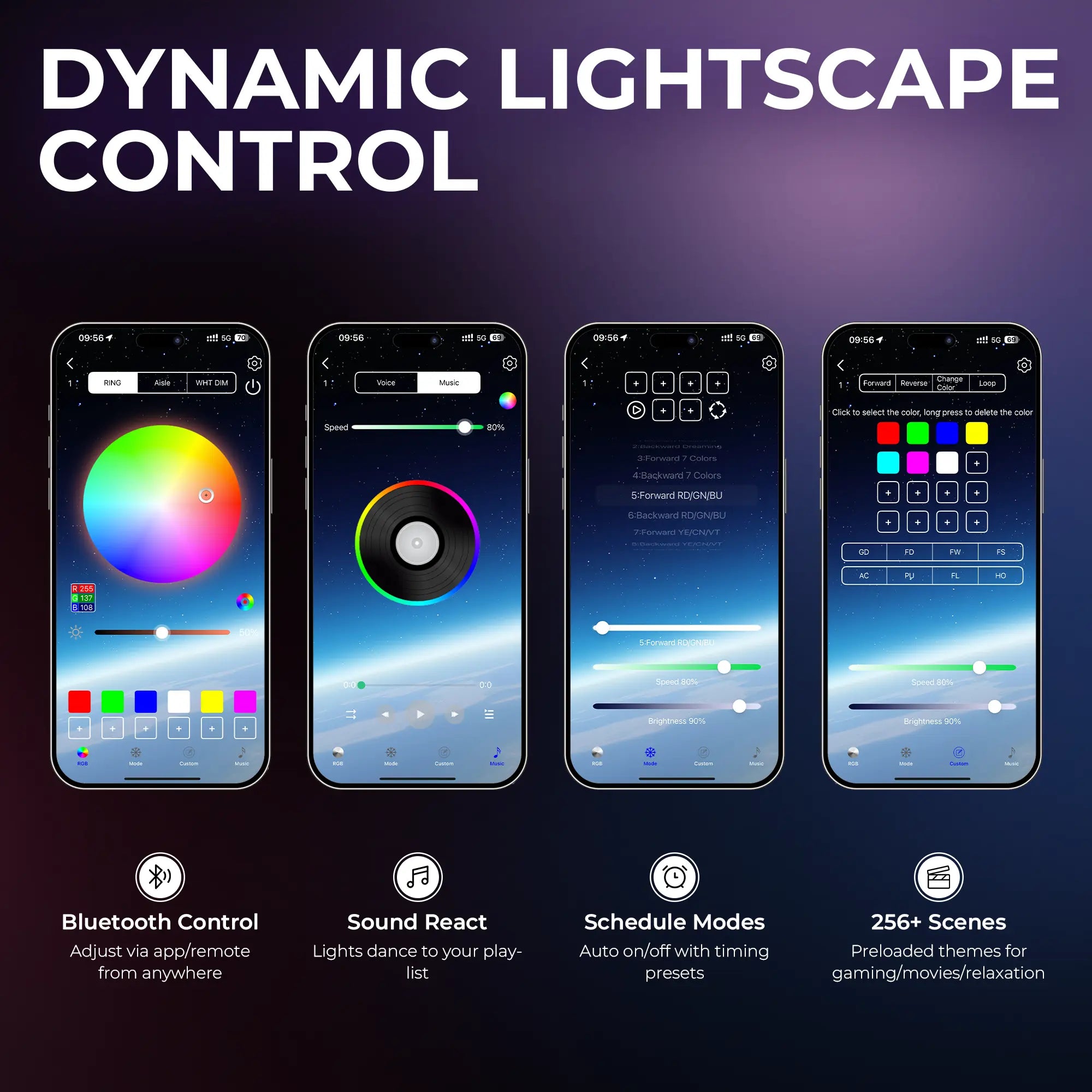 Dynamic lightscape control: bluetooth, sound react, schedule modes, 256+ scenes