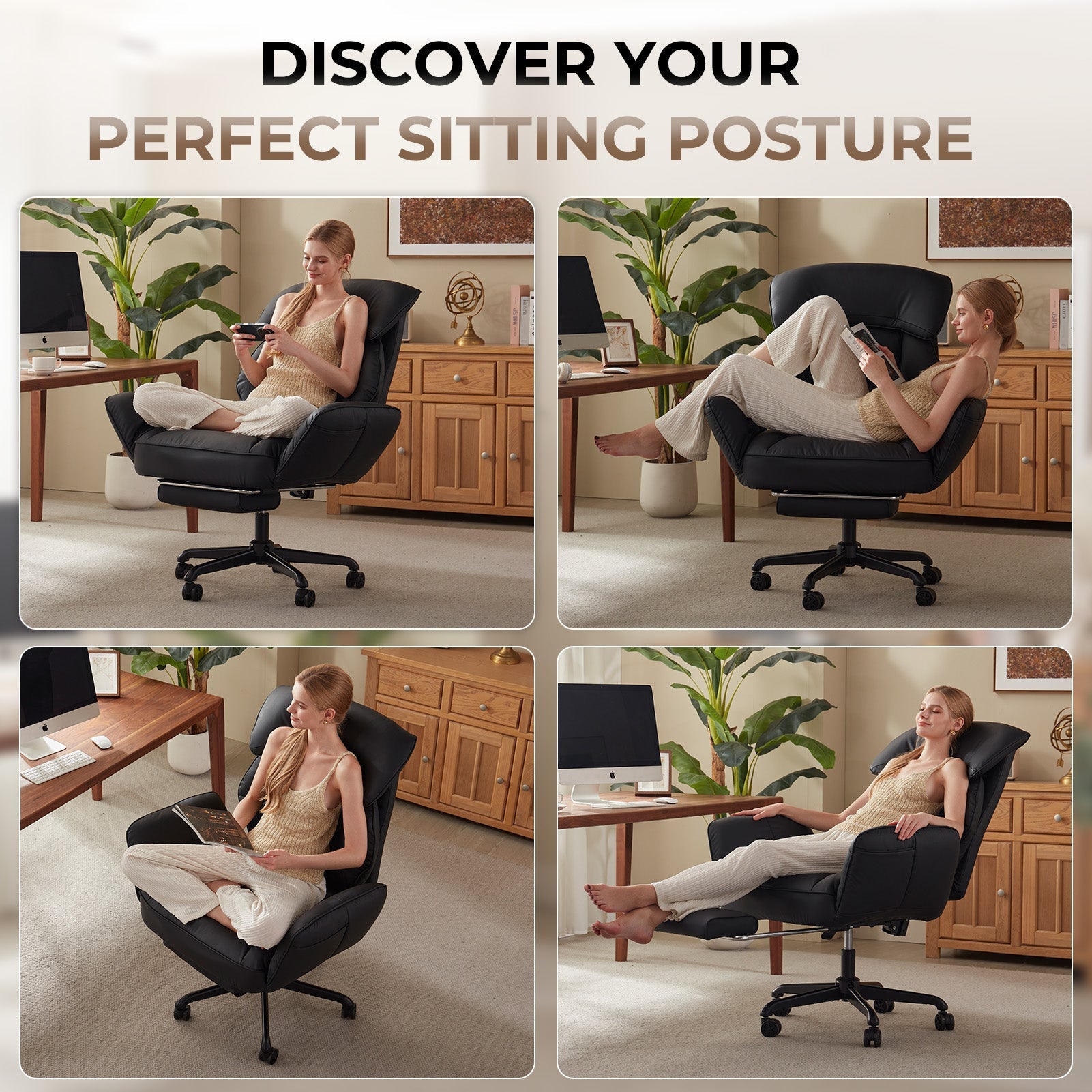- Regulowane oparcie: od 90° do 135°: Dostosuj oparcie od pionowych 90° do skupionej pracy do zrelaksowanych 135° na przerwy. Bez wysiłku odchyl się do tyłu, aby czytać, oglądać treści lub krótko odpocząć. Ta elastyczność pomaga zmniejszyć zmęczenie i sprzyja zdrowszej postawie przez cały dzień.